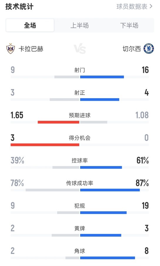卡拉巴赫2-2切尔西全场数据:射门9-16,射正3-4,控球率39%-61%